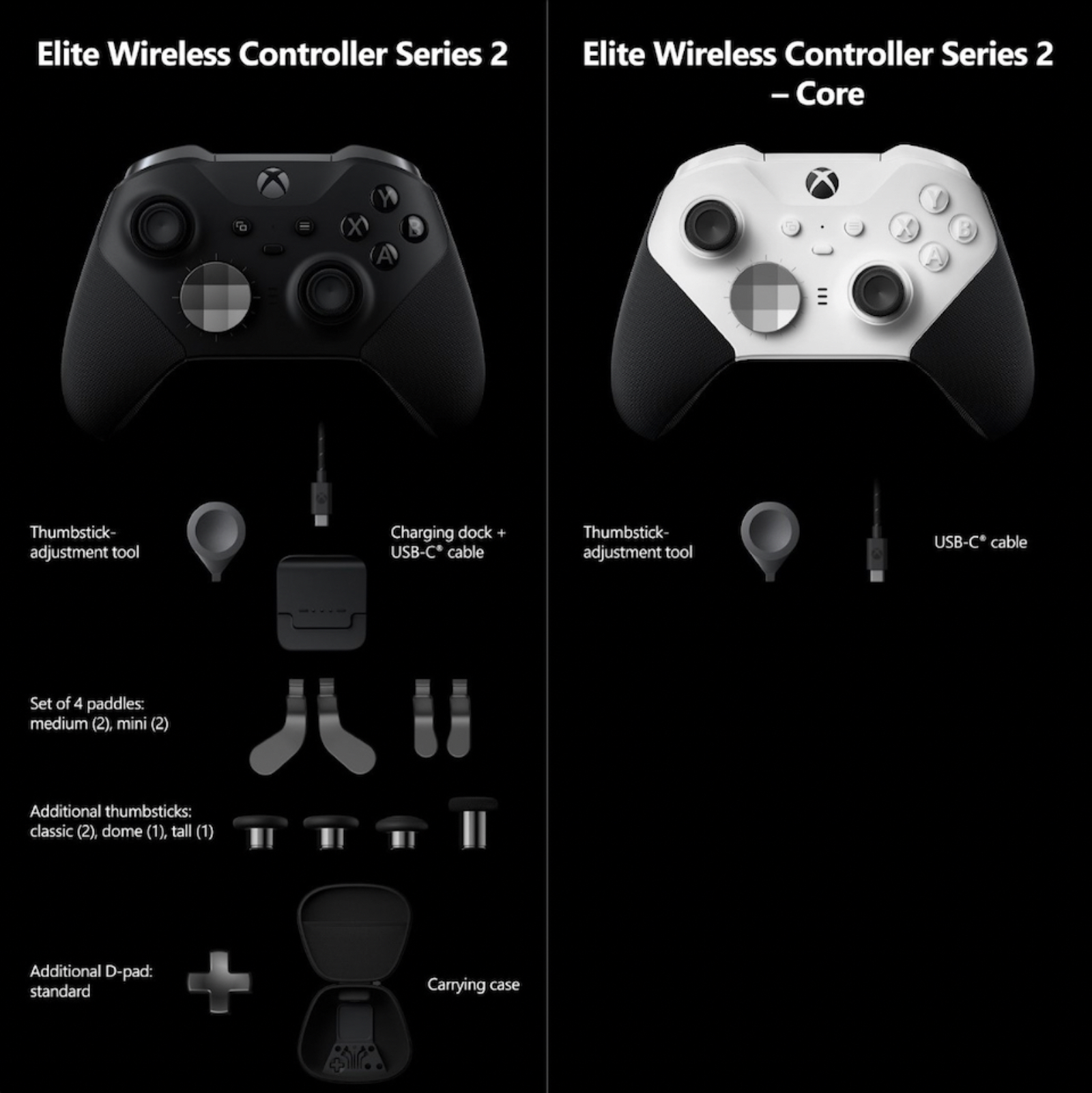 کنترلر الیت سری 2 Core فاقد پایه شارژ، کیف، دکمه های چهار جهت، چهار آنالوگ و به اضافه چهار عدد پدال است بلکه فقط دارای کابل USB و پیچی مخصوص برای تعویض دکمه ها است اگرچه عدم لوازم جانبی در این کنترلر به نوعی جزء نقصان محصول محسوب می شود. اما مایکروسافت باز هم این نقصان را با سازگاری با دکمه ها و آنالوگ های قابل تعویض در کنترلر الیت سری 2 و تهیه کردن آنها به صورت جداگانه برای گیمر، جبران نموده است.